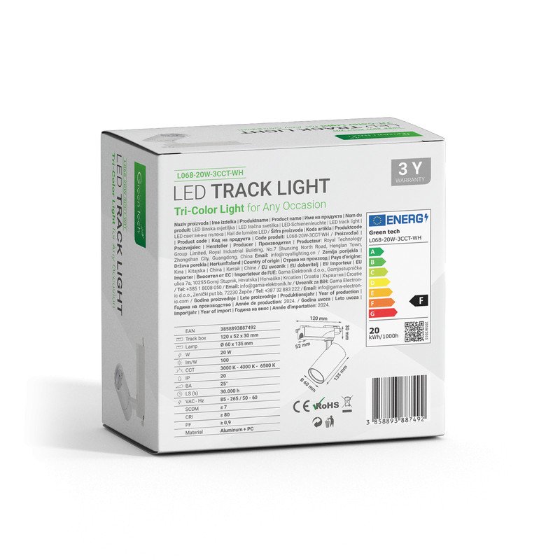 LED šinska svjetiljka Green Tech 20W, 3 CCT, bijela boja