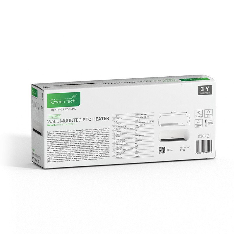 Zidna PTC grijalica Green Tech 2000W, s timerom, električna